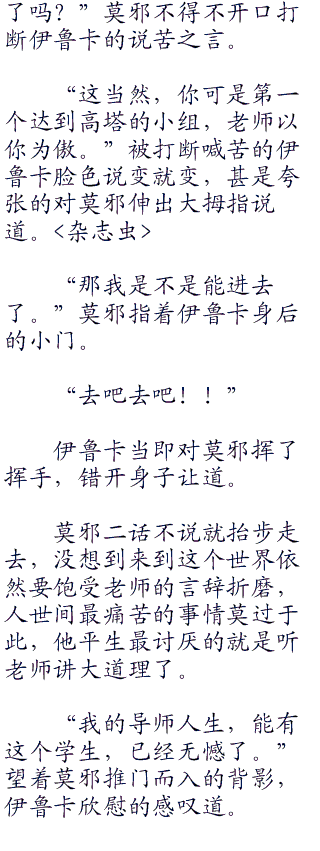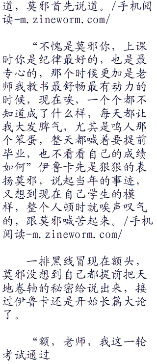 莫邪二话不说就抬步走去,没想到来到这个世界依然要饱受老师的言辞折磨,人世间最痛苦的事情莫过于此,他平生最讨厌的就是听老师讲大道理了。