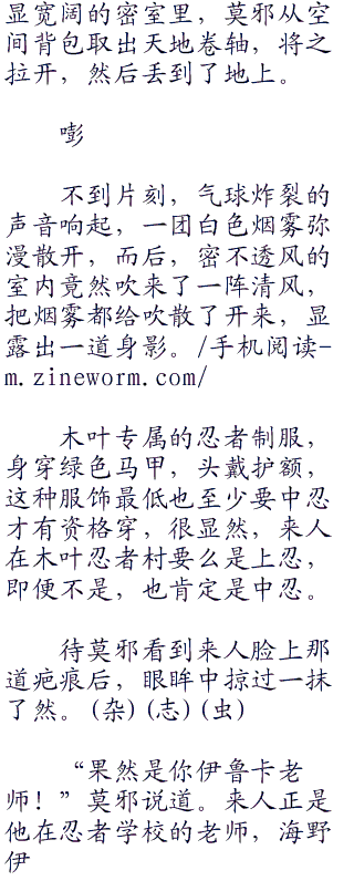 “果然是你伊鲁卡老师!”莫邪说道。来人正是他在忍者学校的老师,海野伊鲁卡。