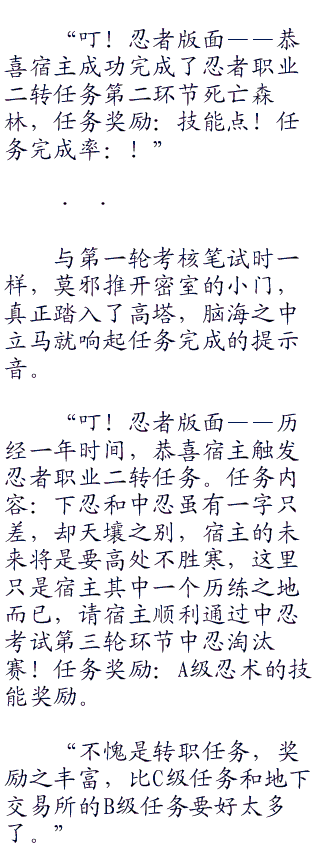 “叮!忍者版面——历经一年时间,恭喜宿主触发忍者职业二转任务。任务内容:下忍和中忍虽有一字只差,却天壤之别,宿主的未来将是要高处不胜寒,这里只是宿主其中一个历练之地而已,请宿主顺利通过中忍考试第三轮环节中忍淘汰赛!任务奖励:A级忍术的技能奖励。