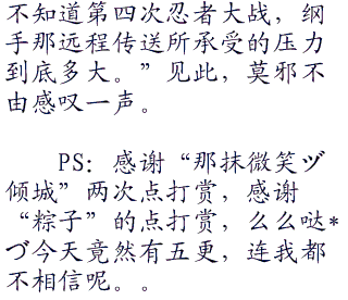 PS:感谢“那抹微笑ヅ倾城”两次点打赏,感谢“粽子”的点打赏,么么哒*づ今天竟然有五更,连我都不相信呢。。