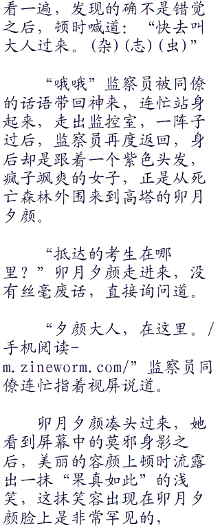 “哦哦”监察员被同僚的话语带回神来,连忙站身起来,走出监控室,一阵子过后,监察员再度返回,身后却是跟着一个紫色头发,疯子飒爽的女子,正是从死亡森林外围来到高塔的卯月夕颜。