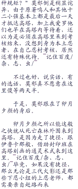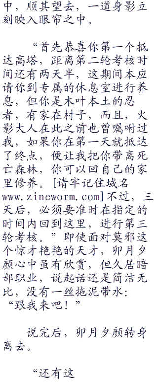 “首先恭喜你第一个抵达高塔,距离第二轮考核时间还有两天半,这期间本应请你到专属的休息室进行养息,但你是木叶本土的忍者,有家在村子,而且,火影大人在此之前也曾嘱咐过我,如果你在第一天就抵达了终点,便让我把你带离死亡森林,你可以回自己的家里修养。不过,三天后,必须要准时在指定的时间内回到这里,进行第三轮考核。”即使面对莫邪这个惊才艳艳的天才,卯月夕颜心中虽有欣赏,但久居暗部职业,说起话还是简洁无比,没有一丝拖泥带水:“跟我来吧!”