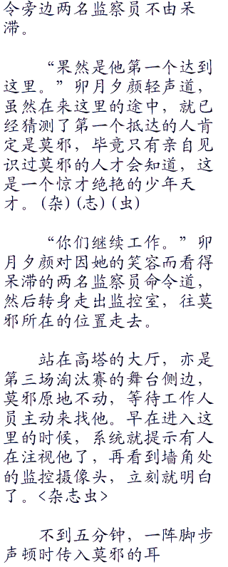 站在高塔的大厅,亦是第三场淘汰赛的舞台侧边,莫邪原地不动,等待工作人员主动来找他。早在进入这里的时候,系统就提示有人在注视他了,再看到墙角处的监控摄像头,立刻就明白了。