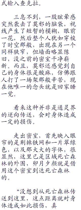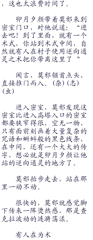 进入密室,莫邪发现这密室比进入高塔入口的密室都要狭窄得很,空无一物,只有面前刻画着大量复杂的咒语和蝌蚪般的黑色线条,在中间,还有一个大大的传字,想必就是卯月夕颜让他站的逆向通灵的地方了。