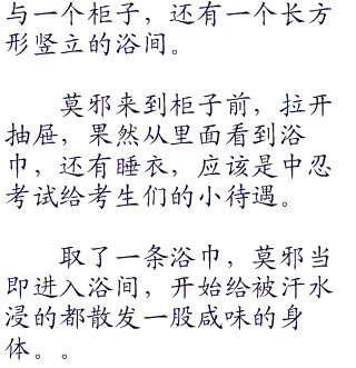 莫邪来到柜子前,拉开抽屉,果然从里面看到浴巾,还有睡衣,应该是中忍考试给考生们的小待遇。