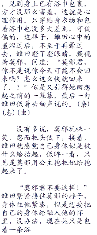 “莫邪君不要这样!”雏田紧紧搂住莫邪的脖子,身体往他紧凑,似是想要把自己的身体给融入他的怀里,没办法,现在她只是包着一条浴巾而已,稍稍震动,就很可能会把浴巾给抖散。