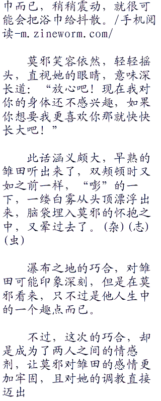 莫邪笑容依然,轻轻摇头,直视她的眼睛,意味深长道:“放心吧!现在我对你的身体还不感兴趣,如果你想要我更喜欢你那就快快长大吧!”