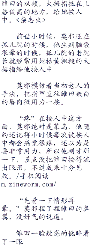 前世小时候,莫邪还在孤儿院的时候,他生病脑袋很晕的时候,孤儿院的老院长就经常用她枯黄粗糙的大拇指给他按人中。
