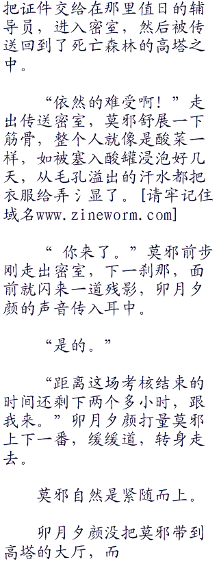 吃过雏田做的菜品,莫邪比当天从死亡森林回来时要提早几个小时来到逆向传送地点,把证件交给在那里值日的辅导员,进入密室,然后被传送回到了死亡森林的高塔之中。