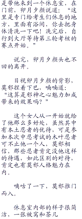 卯月夕颜没把莫邪带到高塔的大厅,而是带他来到一个休息室,在门前,卯月夕颜说道:“这里是专门给考生们休息的地方,里面有浴间,你去把身体清洗一下吧!洗完后,自行到大厅等待第三轮考核的赛点开始。”