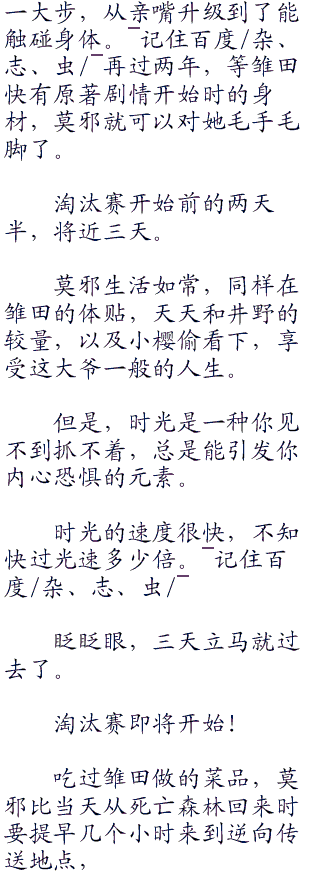 不过,这次的巧合,却是成为了两人之间的情感剂,让莫邪对雏田的感情更加牢固,且对她的调教直接迈出一大步,从亲嘴升级到了能触碰身体。再过两年,等雏田快有原著剧情开始时的身材,莫邪就可以对她毛手毛脚了。