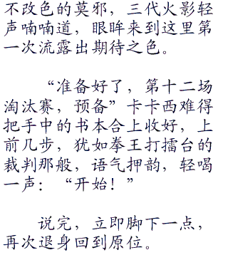 “准备好了,第十二场淘汰赛,预备”卡卡西难得把手中的书本合上收好,上前几步,犹如拳王打擂台的裁判那般,语气押韵,轻喝一声:“开始!”