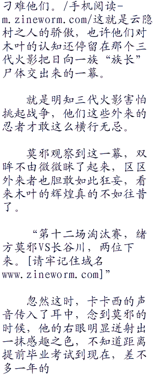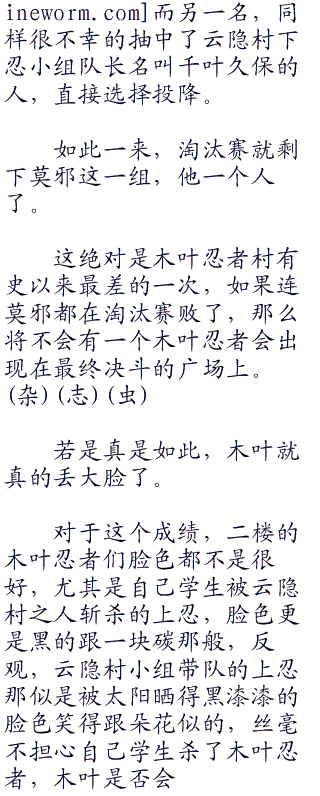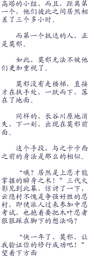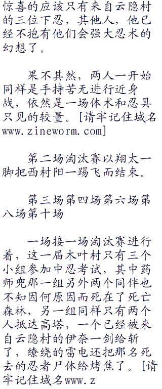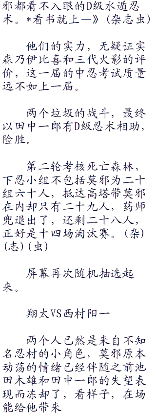 两个人已然是来自不知名忍村的小角色,莫邪原本动荡的情绪已经伴随之前池田木雄和田中一郎的失望表现而冻却了,看样子,在场能给他带来惊喜的应该只有来自云隐村的三位下忍,其他人,他已经不抱有他们会强大忍术的幻想了。