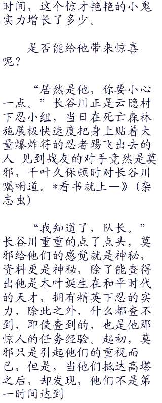 “居然是他,你要小心一点。”长谷川正是云隐村下忍小组,当日在死亡森林施展极快速度把身上贴着大量爆炸符的忍者踢飞出去的人 见到战友的对手竟然是莫邪,千叶久保顿时对长谷川嘱咐道。