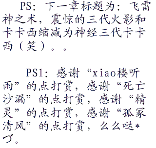 PS:下一章标题为:飞雷神之术,震惊的三代火影和卡卡西缩减为神经三代卡卡西(笑)。。