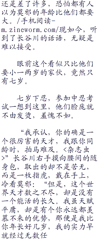 莫邪成熟的气质和身高,如果不是因为他那虽在同龄人中算是偏高的身材,与他们相比还是差了许多,恐怕都有人以为莫邪的年龄比他们都要大。现如今,听到了长谷川的话语,无疑是难以接受。