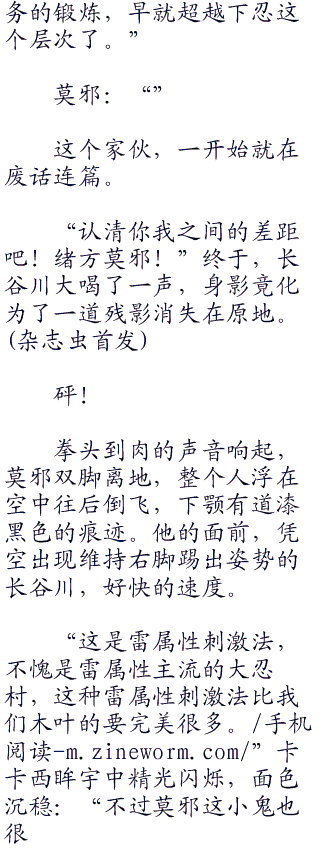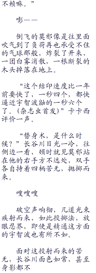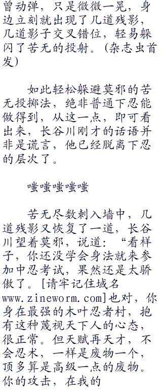 如此轻松躲避莫邪的苦无投掷法,绝非普通下忍能做得到,从这一点,即可看出来,长谷川刚才的话语并非是谎言,他已经脱离下忍的层次了。