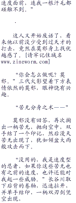 莫邪没有回答,再次掏出一柄苦无,抛向空中,双手结了一个印记,然后漫天苦无出现了,犹如倾盆大雨般攻击而下。