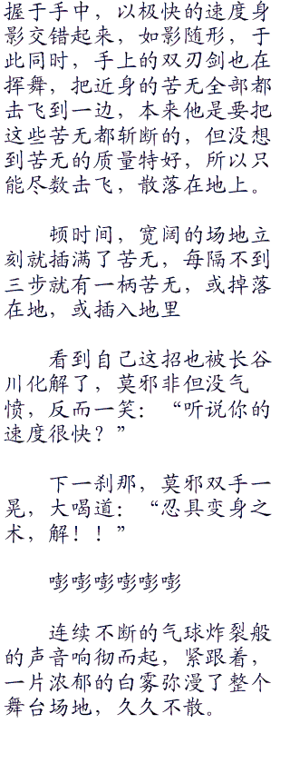 “没用的,我是速度型的忍者,如果你这些苦无也有之前的速度,也许还能对我起一些威胁。”长谷川取下后背的卷轴,迅速拉开,并单手结印,一柄双刃剑凭空出现,握于手中,以极快的速度身影交错起来,如影随形,于此同时,手上的双刃剑也在挥舞,把近身的苦无全部都击飞到一边,本来他是要把这些苦无都斩断的,但没想到苦无的质量特好,所以只能尽数击飞,散落在地上。