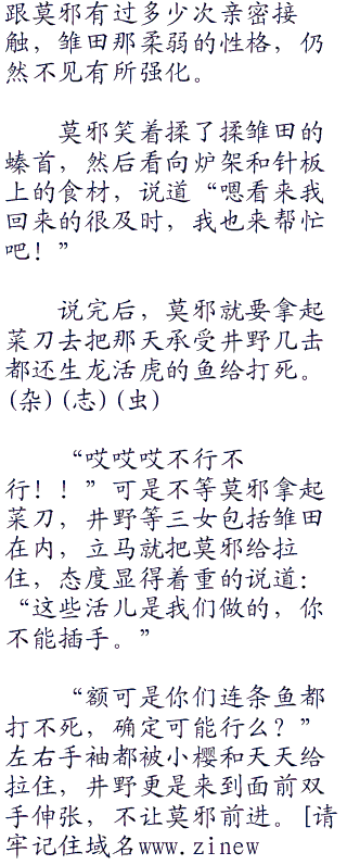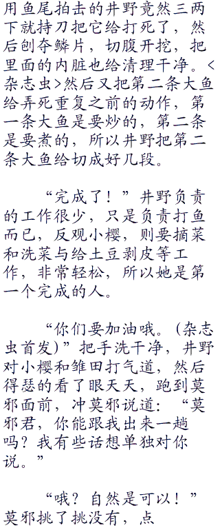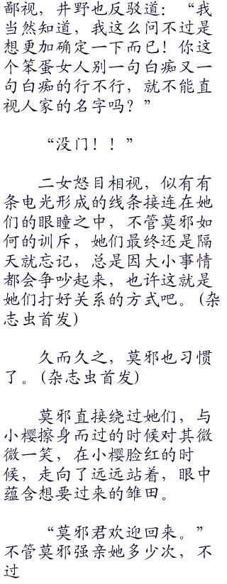 (除了雏田和莫邪的关系确立之外,井野三女就像是厚脸皮赶都赶不走的粘土,感情逐渐加深,这一章和下章,将确立第二位女主的地位。)
