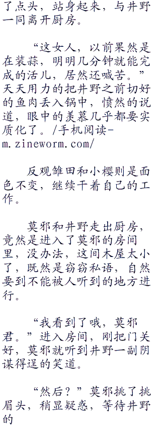 莫邪和井野走出厨房,竟然是进入了莫邪的房间里,没办法,这间木屋太小了,既然是窃窃私语,自然要到不能被人听到的地方进行。