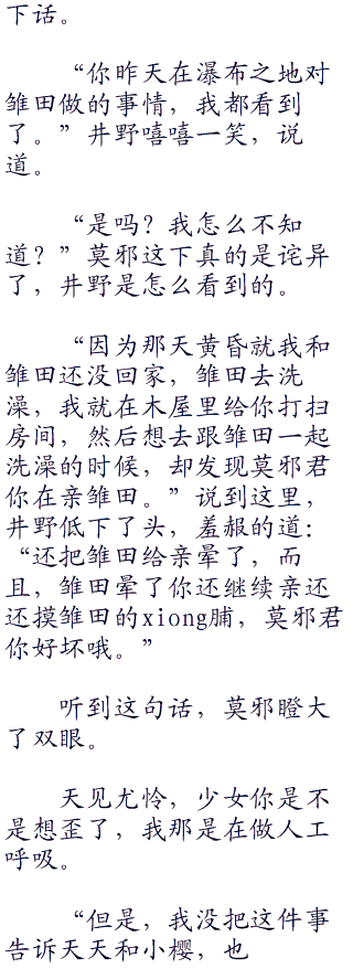 “因为那天黄昏就我和雏田还没回家,雏田去洗澡,我就在木屋里给你打扫房间,然后想去跟雏田一起洗澡的时候,却发现莫邪君你在亲雏田。”说到这里,井野低下了头,羞赧的道:“还把雏田给亲晕了,而且,雏田晕了你还继续亲还还摸雏田的xiong脯,莫邪君你好坏哦。”