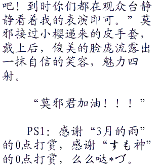 “莫邪君,你要加油哦,把所有敌人都狠狠打趴在地上,成为冠军。”