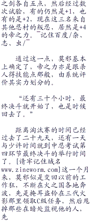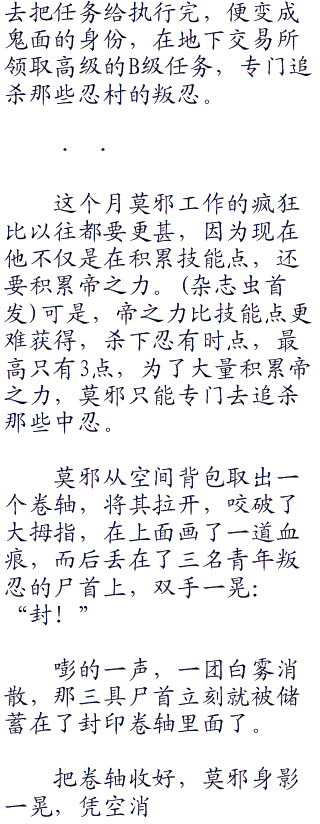 这个月莫邪工作的疯狂比以往都要更甚,因为现在他不仅是在积累技能点,还要积累帝之力。可是,帝之力比技能点更难获得,杀下忍有时点,最高只有3点,为了大量积累帝之力,莫邪只能专门去追杀那些中忍。