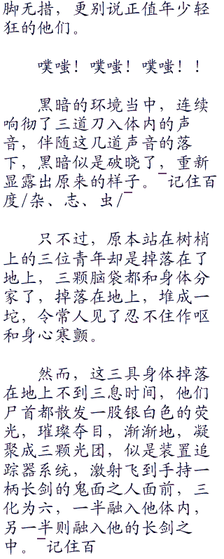 然而,这三具身体掉落在地上不到三息时间,他们尸首都散发一股银白色的荧光,璀璨夺目,渐渐地,凝聚成三颗光团,似是装置追踪器系统,激射飞到手持一柄长剑的鬼面之人面前,三化为六,一半融入他体内,另一半则融入他的长剑之中。