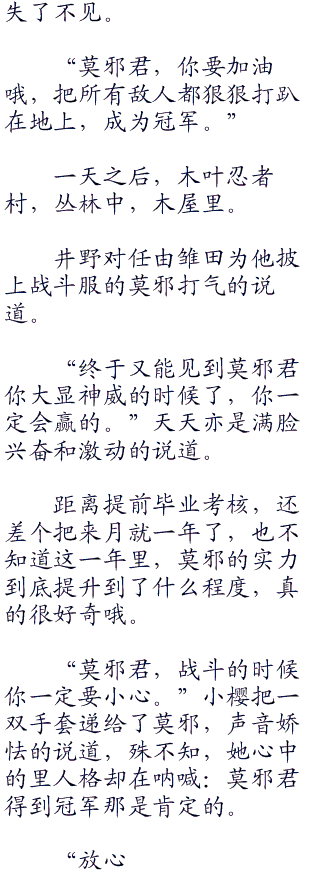“莫邪君,战斗的时候你一定要小心。”小樱把一双手套递给了莫邪,声音娇怯的说道,殊不知,她心中的里人格却在呐喊:莫邪君得到冠军那是肯定的。