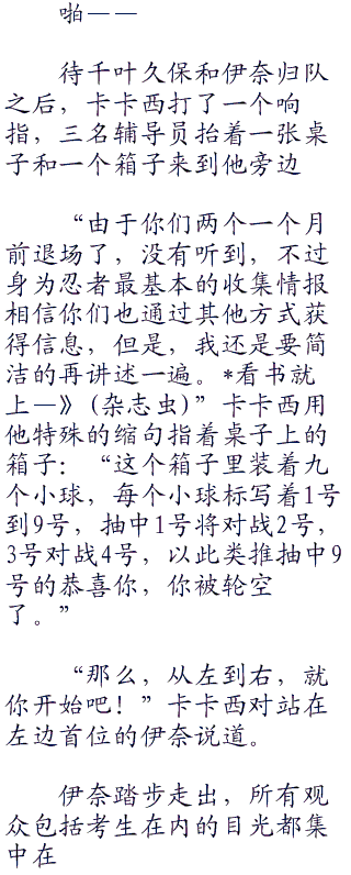 “由于你们两个一个月前退场了,没有听到,不过身为忍者最基本的收集情报相信你们也通过其他方式获得信息,但是,我还是要简洁的再讲述一遍。”卡卡西用他特殊的缩句指着桌子上的箱子:“这个箱子里装着九个小球,每个小球标写着1号到9号,抽中1号将对战2号,3号对战4号,以此类推抽中9号的恭喜你,你被轮空了。”