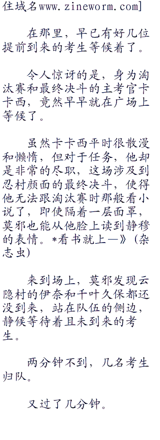 虽然卡卡西平时很散漫和懒惰,但对于任务,他却是非常的尽职,这场涉及到忍村颜面的最终决斗,使得他无法跟淘汰赛时那般看小说了,即使隔着一层面罩,莫邪也能从他脸上读到静穆的表情。
