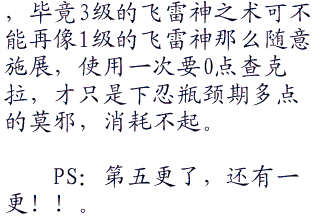 而莫邪纯属是不想为了耍酷而施展飞雷神之术,毕竟3级的飞雷神之术可不能再像1级的飞雷神那么随意施展,使用一次要0点查克拉,才只是下忍瓶颈期多点的莫邪,消耗不起。