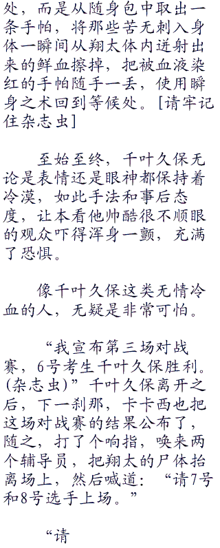 把苦无从翔太体内拔出,千叶久保微用力,伸手把眼神恍惚,仿佛还没从被瞬杀一幕中回过神来的翔太推倒在地上,彻底死绝了。将翔太杀了后,千叶久保没有立刻转身走向考生等候处,而是从随身包中取出一条手帕,将那些苦无刺入身体一瞬间从翔太体内迸射出来的鲜血擦掉,把被血液染红的手帕随手一丢,使用瞬身之术回到等候处。