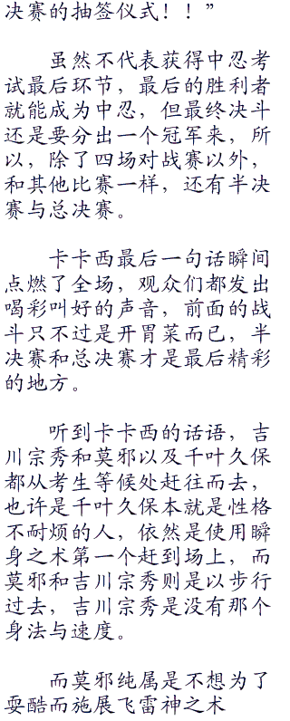 虽然不代表获得中忍考试最后环节,最后的胜利者就能成为中忍,但最终决斗还是要分出一个冠军来,所以,除了四场对战赛以外,和其他比赛一样,还有半决赛与总决赛。