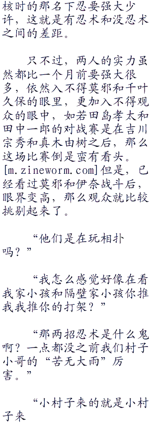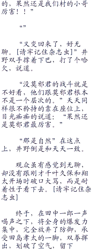 只不过,两人的实力虽然都比一个月前要强大很多,依然入不得莫邪和千叶久保的眼里,更加入不得观众的眼中,如若田岛孝太和田中一郎的对战赛是在吉川宗秀和真木由树之后,那么这场比赛倒是蛮有看头。但是,已经看过莫邪和伊奈战斗后,眼界变高,那么观众就比较挑剔起来了。