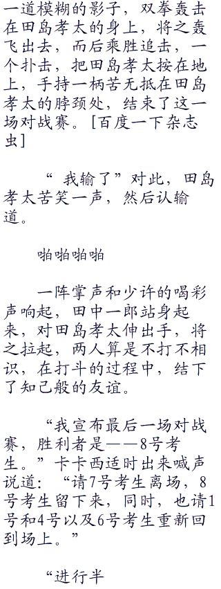 终于,在田中一郎一声喝声之下,将全身的爆发力集中,完全放弃了防御,承受田岛孝太的一脚,双拳挥出,划破了空气,留下一道模糊的影子,双拳轰击在田岛孝太的身上,将之轰飞出去,而后乘胜追击,一个扑击,把田岛孝太按在地上,手持一柄苦无抵在田岛孝太的脖颈处,结束了这一场对战赛。
