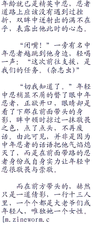“闭嘴!”一旁有名中年忍者越跳到他身边,轻喝一声:“这次前往支援,是我们的任务。”