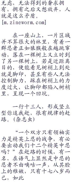 在一座山上,一片区域并不算很大的林里,有着一群忍者正如猿猴般在越跳窜动,落在一棵树上又立时到了另一棵树上,若是近距离目的,便能看见树梢上到处就是脚印,甚至有些人无法控制脚力,踩在树梢上的力度过大,让脚印都陷入树梢里,呈现一个凹坑。