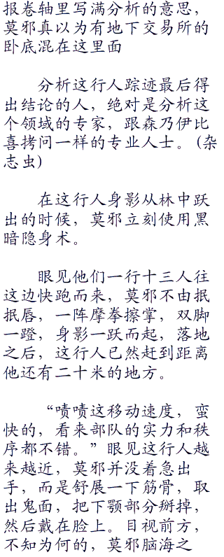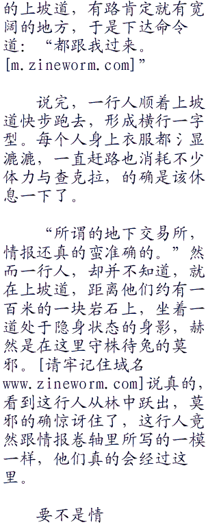 “所谓的地下交易所,情报还真的蛮准确的。”然而一行人,却并不知道,就在上坡道,距离他们约有一百米的一块岩石上,坐着一道处于隐身状态的身影,赫然是在这里守株待兔的莫邪。说真的,看到这行人从林中跃出,莫邪的确惊讶住了,这行人竟然跟情报卷轴里所写的一模一样,他们真的会经过这里。