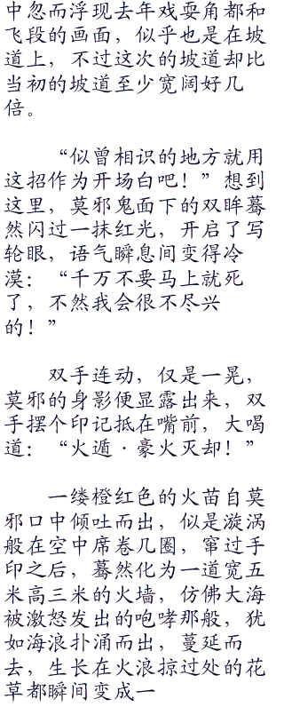 一缕橙红色的火苗自莫邪口中倾吐而出,似是漩涡般在空中席卷几圈,窜过手印之后,蓦然化为一道宽五米高三米的火墙,仿佛大海被激怒发出的咆哮那般,犹如海浪扑涌而出,蔓延而去,生长在火浪掠过处的花草都瞬间变成一堆漆黑的灰烬。