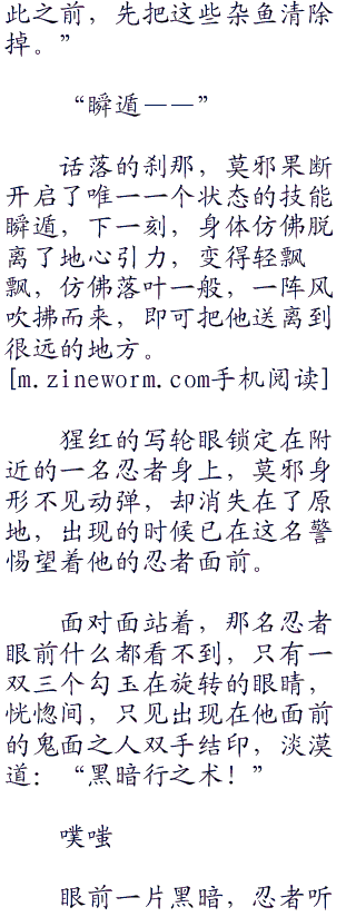 猩红的写轮眼锁定在附近的一名忍者身上,莫邪身形不见动弹,却消失在了原地,出现的时候已在这名警惕望着他的忍者面前。