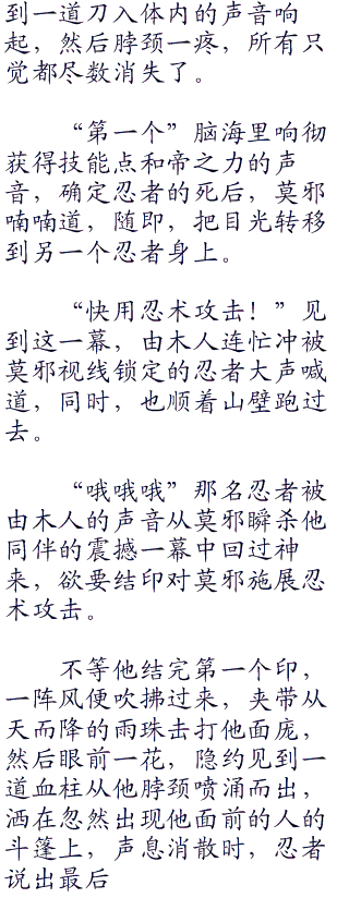 “哦哦哦”那名忍者被由木人的声音从莫邪瞬杀他同伴的震撼一幕中回过神来,欲要结印对莫邪施展忍术攻击。