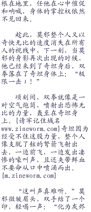 趁此,莫邪整个人又以奇快无比的速度消失在所有人的视线中,下一刻,当莫邪的身影再次出现的时候,他已经来到了奇坦身后,双拳落在了奇坦身体上:“极限一击」!”