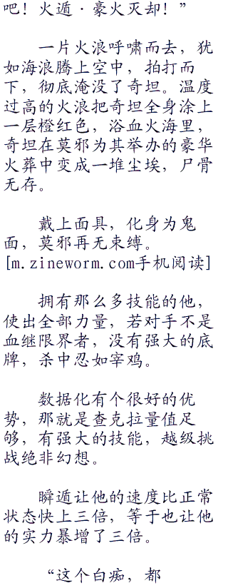 一片火浪呼啸而去,犹如海浪腾上空中,拍打而下,彻底淹没了奇坦。温度过高的火浪把奇坦全身涂上一层橙红色,浴血火海里,奇坦在莫邪为其举办的豪华火葬中变成一堆尘埃,尸骨无存。