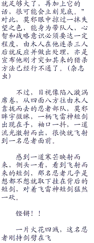 (群忌的忍术,进入一个状态里,使自身速度得以暴增。”又旅不愧为忍界存活最久的九只尾兽之一,见识比由木人高上何止数十倍,瞬间就发现莫邪移动速度变快的原因。