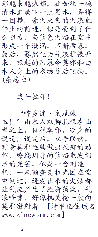 火浪淹没了几颗查克拉光团,爆炸声亦是从中传出,本是橙红色的火浪忽然出现了一抹蓝色。然后,这抹蓝色越来越大,色彩越来越浓郁,犹如往一碗清水里滴下一点墨水,弄得一团糟。豪火灭失的火浪也停止的前进,似是受到了什么阻力,与蓝色火焰在空中形成一个漩涡,不断席卷,最后,蓦然化为气浪扩散开来,掀起的风暴令莫邪和由木人身上的衣物往后飞扬。
