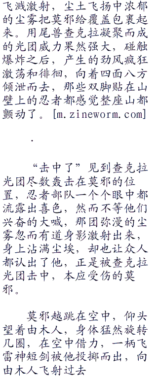 莫邪所在的位置顿时发出一声爆炸声,残砖石片飞溅激射,尘土飞扬中浓郁的尘雾把莫邪给覆盖包裹起来。用尾兽查克拉凝聚而成的光团威力果然强大,碰触爆炸之后,产生的劲风疯狂激荡和徘徊,向着四面八方倾泄而去,那些双脚贴在山壁上的忍者都感觉整座山都颤动了。