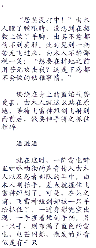 就在这时,一阵雷电噼里啪啦响彻的声音传入由木人以及忍者部队的耳中,由木人刚抬手,差点就握住飞雷神短剑了。可是,在她之前,飞雷神短剑却被一只手给抓住了,一道身影凭空出现,一手握着短剑手柄,另一只手,则布满了蓝色的雷电,电芒闪烁,散发的声音似是有千只鸟儿齐鸣喊叫,配上那双猩红浴血的写轮眼,让由木人脑海里浮现了一个人物名字。