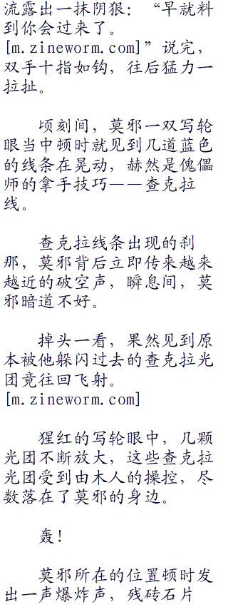 顷刻间,莫邪一双写轮眼当中顿时就见到几道蓝色的线条在晃动,赫然是傀儡师的拿手技巧——查克拉线。